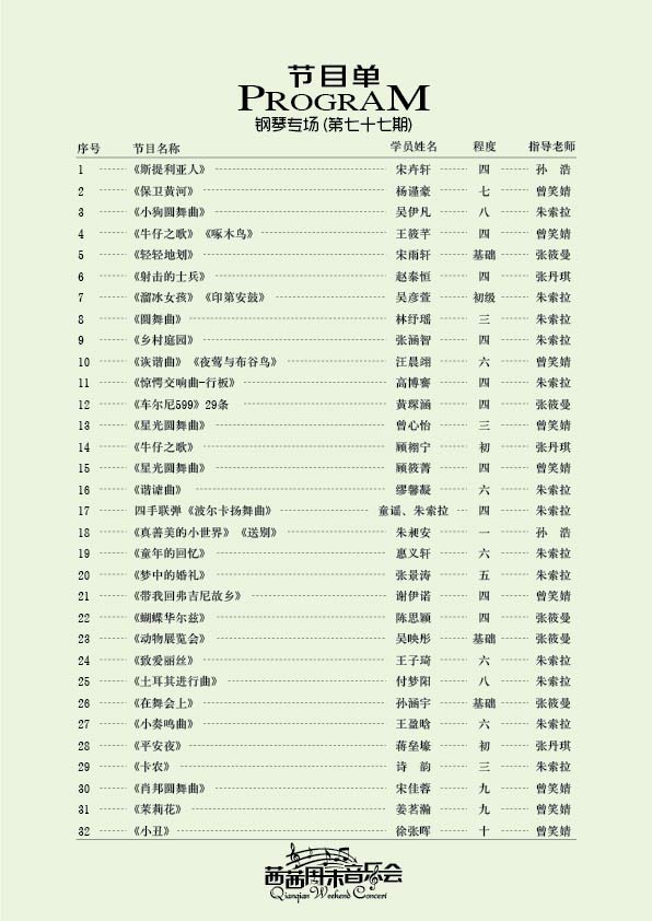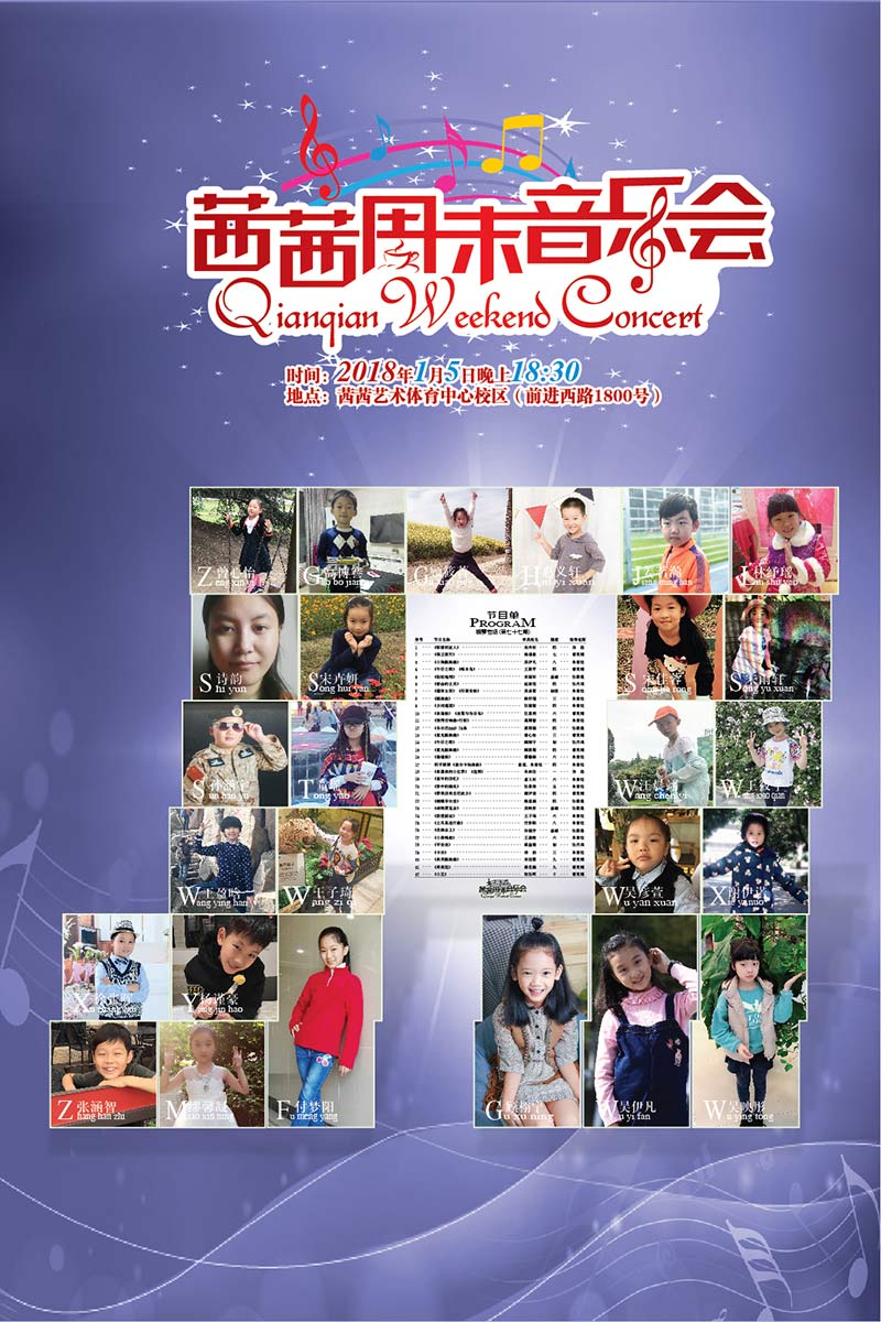 七十七期周末師生音樂(lè )會(huì )—鋼琴專(zhuān)場(chǎng)于2018年1月5日晚在茜茜藝術(shù)體育中心校區舉行!